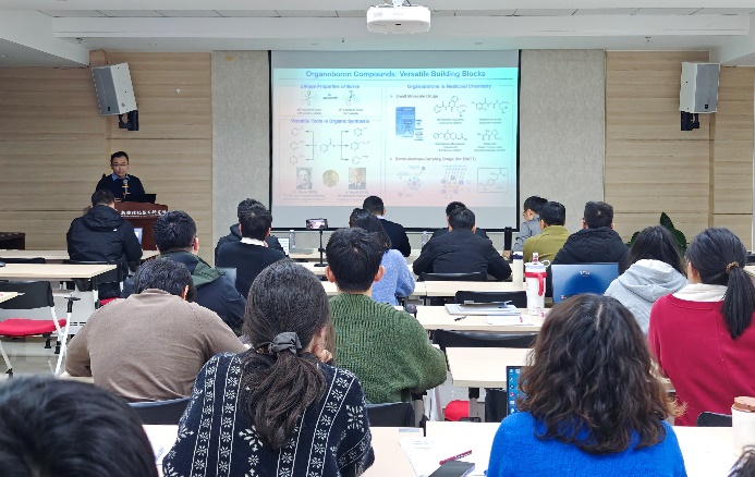 洪恺教授做了题为“偕位卤代二硼酸酯化合物的合成与应用”的学术报告。他表示,有机硼化合物是合成化学中的重要中间体,在材料化学、生物医药等领域具有广泛应用。硼原子α位的额外官能团取代会显著影响其化学性质,并赋予其多样性的转化能力。报告中,洪恺教授详细介绍了课题组在偕位卤代二硼酸酯化合物的合成与应用方面的工作,尤其是通过系统研究,发现了该类化合物可作为不同类型的试剂参与多种转化,表现出高度的可调控性。具体而言,它们既可以作为亲电试剂、亲核试剂,也可以作为自由基前体参与多种催化或非催化反应,所得产物具备进一步衍生化的能力。这些方法为快速构建复杂含硼化合物提供了新思路,并在药物分子的高效合成中展现出潜在应用价值。