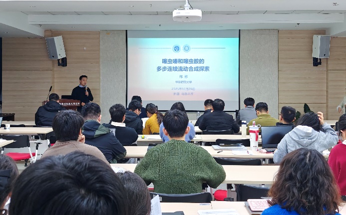 邢栋教授在题为“噻虫嗪和噻虫胺的多步连续流动合成研究”的学术报告中,重点阐述了连续流动化学技术作为现代合成化学的重要发展方向,凭借其高效的传质传热性能、优异的过程控制能力以及良好的可放大性,在药物与农药绿色合成中展现出显著优势。他表示,尤其在涉及强放热、高危试剂或不稳定中间体的多步反应中,连续流技术能够有效提升反应安全性、选择性与整体效率,为复杂分子的规模化制备提供了新路径。随着近期围绕新烟碱类杀虫剂噻虫嗪和噻虫胺的绿色合成展开研究,邢栋教授课题组发展了一条以廉价丙醛为起始原料的多步连续流动合成策略。他通过详实的数据向与会师生展示出,与传统的间歇工艺相比,该流动化学路线在反应效率、绿色化、放大化等方面都体现出了良好的应用前景和潜力。