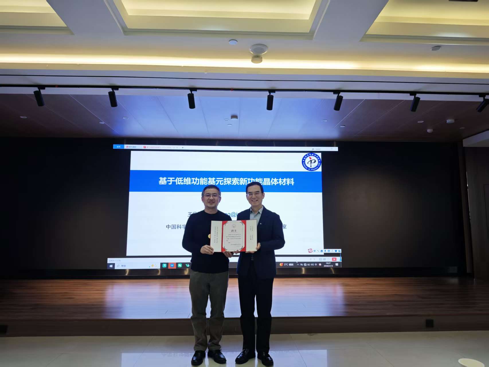 报告中,王刚研究员首先介绍研究背景,随后围绕 “二维功能基元在新超导体、拓扑材料中的探索”“准一维功能基元与新功能材料的关联” 展开核心分享,还同步介绍了团队正在开展的研究工作,最后结合领域趋势进行总结与展望。其分享覆盖低维功能基元的结构特性、材料设计思路与应用前景,为在场科研人员带来了该领域的前沿动态与创新方向,现场交流氛围热烈。报告结束,潘世烈所长为王刚研究员颁发了“丝路”前沿交叉学术论坛报告专家聘书。