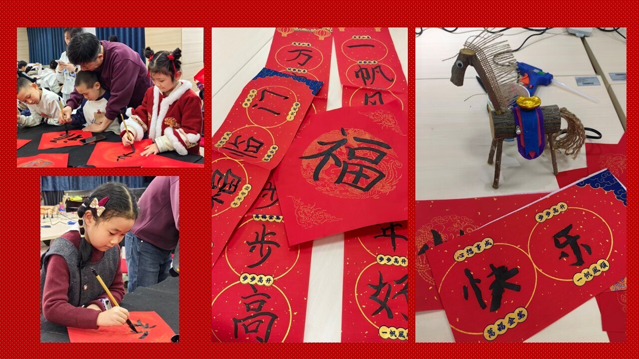 活动分为马年创意手工与春联福字书写两大环节,趣味与文化相融、动手与传承并行。孩子们在老师的耐心指导下,与家长携手拼装、装饰小木马,一双双小手灵活穿梭,一件件憨态可掬的马年手工作品次第呈现,寓示着马年吉祥、奋进向上的美好祝愿,现场欢声笑语不断。