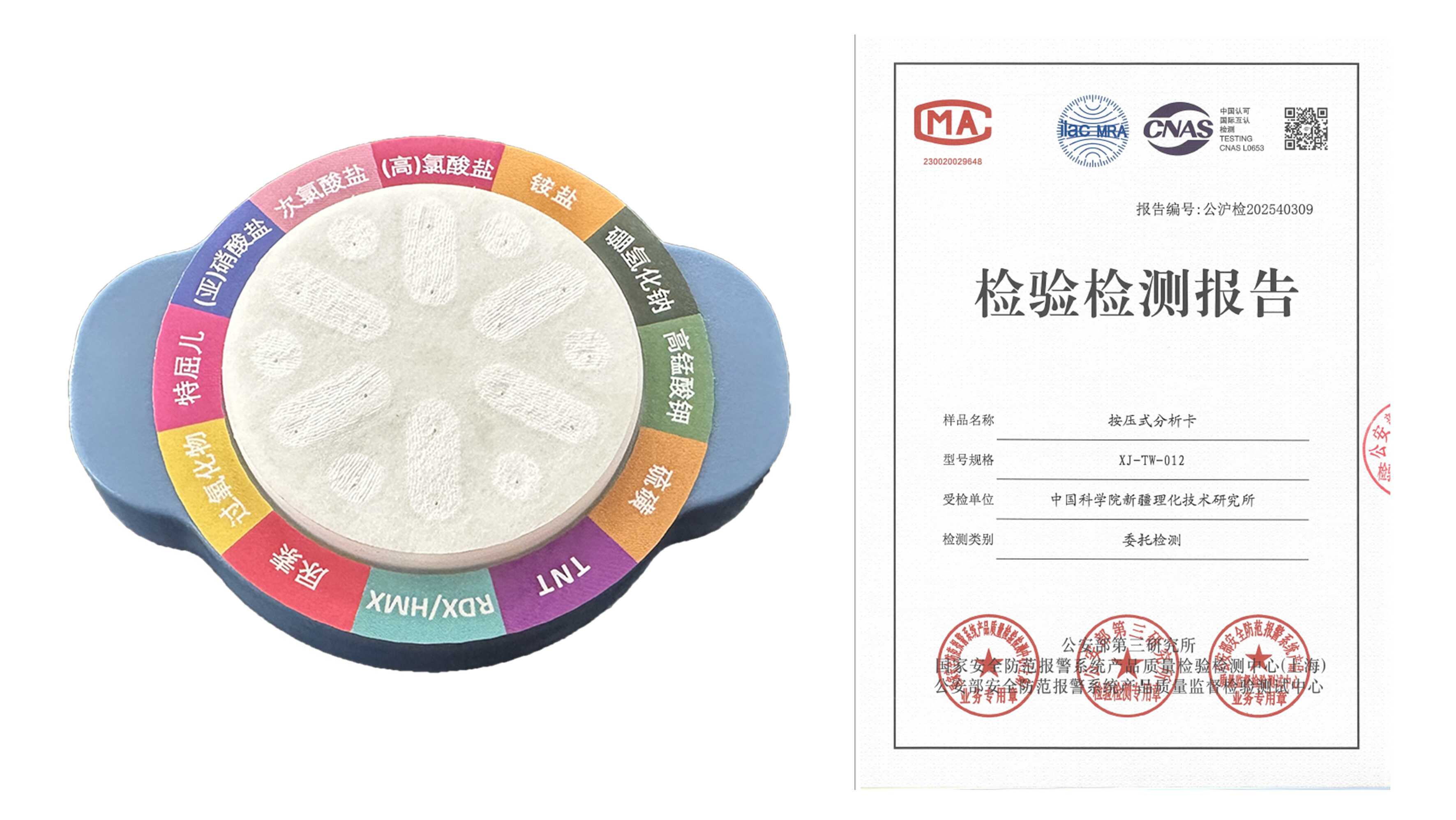 针对入户排查、排爆、爆炸物现场快速检测的实战需求,研发团队以炸药立显试剂箱检测试剂为核心,创制高准确性、强针对性、高性价比的按压式爆炸物现场分析卡,通过擦拭采样后使用底部按压方式,试剂与待测物接触显色,对照比色卡同步确定成分,已获得国家及公安部产品检验报告(公沪检202540309)。