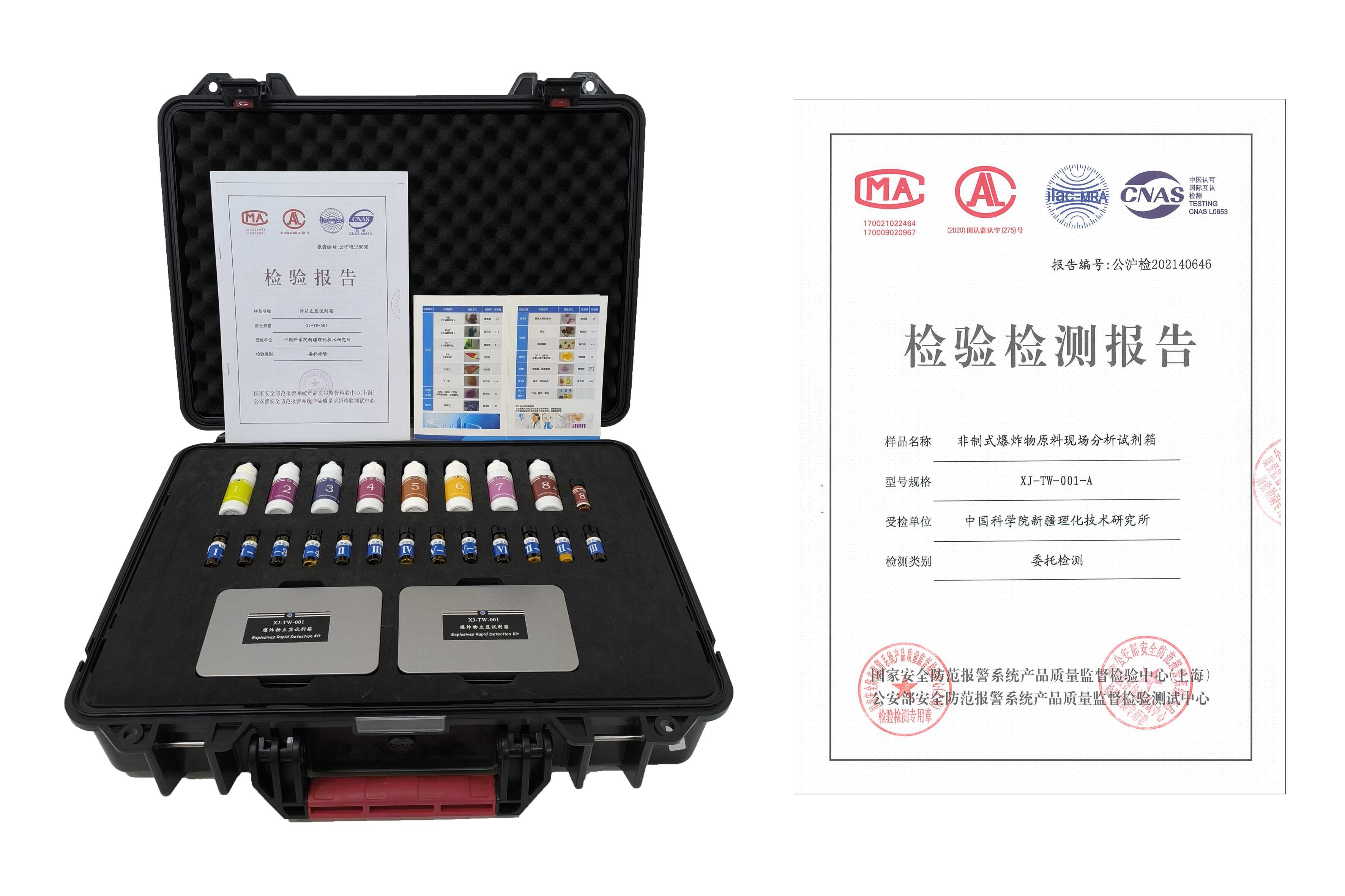 针对我国爆炸物,尤其是非制式爆炸物现场快速检测需求,研发团队基于化学比色原理,开发了功能齐全、准确性高、针对性强、性价比高的XJ-TW-001炸药立显试剂箱,已获得国家及公安部产品质量检验报告(公沪检202140646),并入选国家“十三五“科技创新成就展。