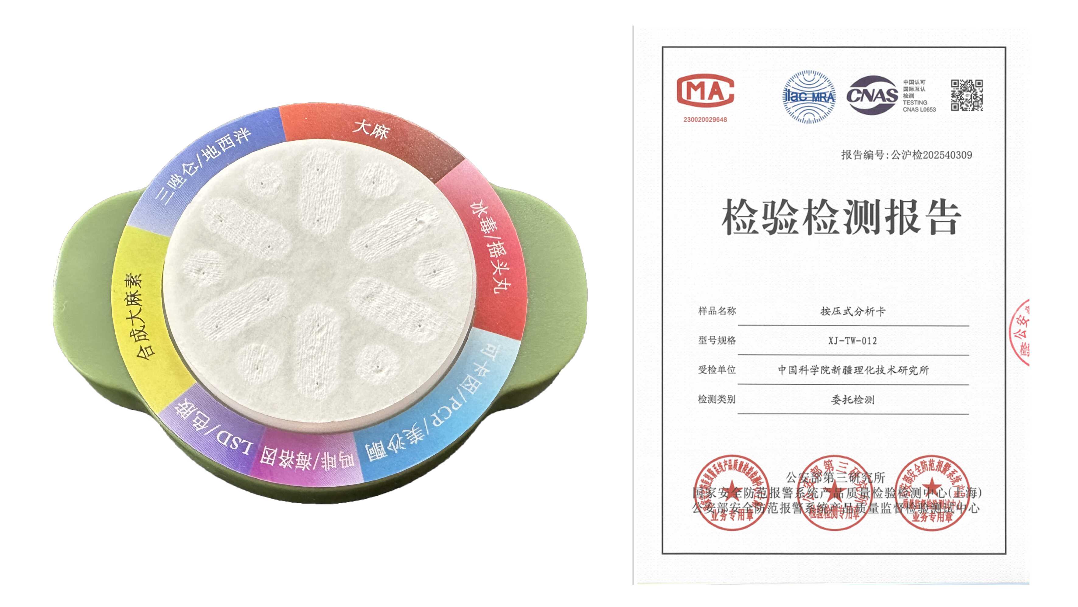 以化学比色/荧光检测原理和机器视觉技术为核心,研发具有一步式采样、智能化分析多种毒品种类的手持式痕量毒品智能检测仪。并基于主流操作系统开发了智能化APP,通过独立反应区设计,结合机器视觉方案,实现了解决现场快速分析毒品种类的需求。已获得国家及公安部产品检验报告(公沪检202444814)。