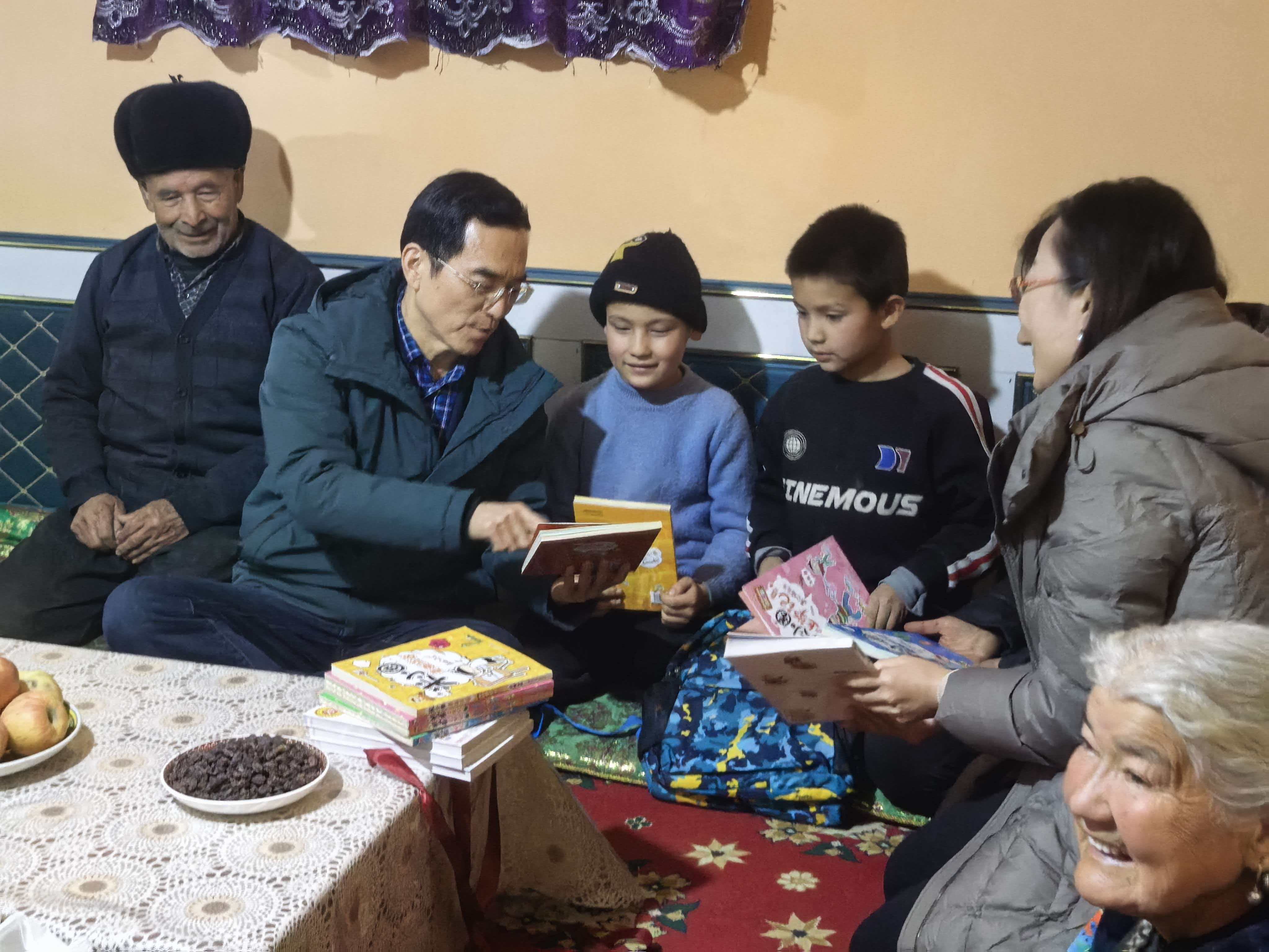 座谈会后,慰问组到村民家中走访慰问,为走访群众送去了米、面、油等生活必需品和慰问金,把党和政府的关怀送到群众心坎上。村民们纷纷表示感谢党的好政策,感谢驻村工作队和帮扶单位的真心帮扶。在阿曼古丽家中,潘世与老人亲切拉家常,关心他们的家庭收入、健康状况、子女教育等方面的情况,他仔细察看住房、饮水等生活条件,并了解国家在教育、医疗保障及各项帮扶政策落实情况。这次潘世烈专门精选了一批儿童书籍送给这家的孩子们,孩子们十分高兴,并大声用国语朗读喜欢的图书,大家十分欣慰,勉励她们好好学习、早日成才,为社会作出贡献。